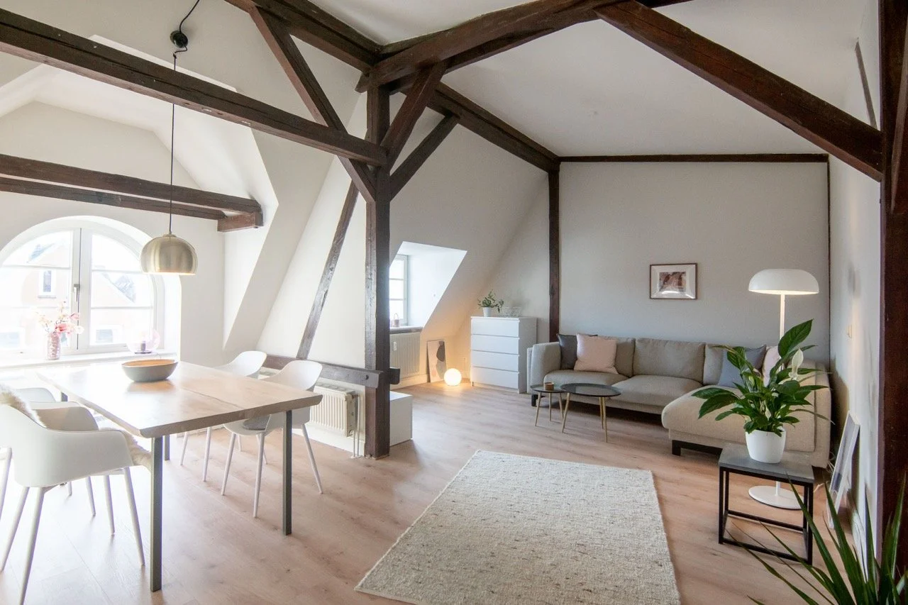 Alte Dachbalken und hohe Decken treffen auf moderne, skandinavische Einrichtung: So entsteht ein Loft mit ganz besonderem Charme.